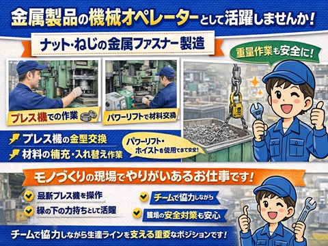 ねじ・ナットなどの小さな金属部品を製造する工場でのお仕事です。