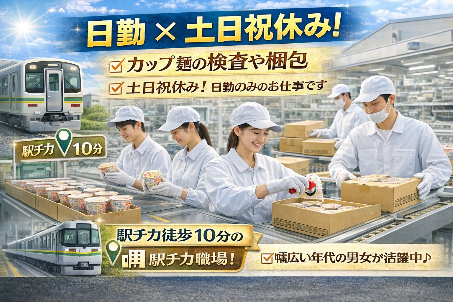 日勤×土日祝休み 駅チカ徒歩10分 カップ麺の検査や梱包 軽作業